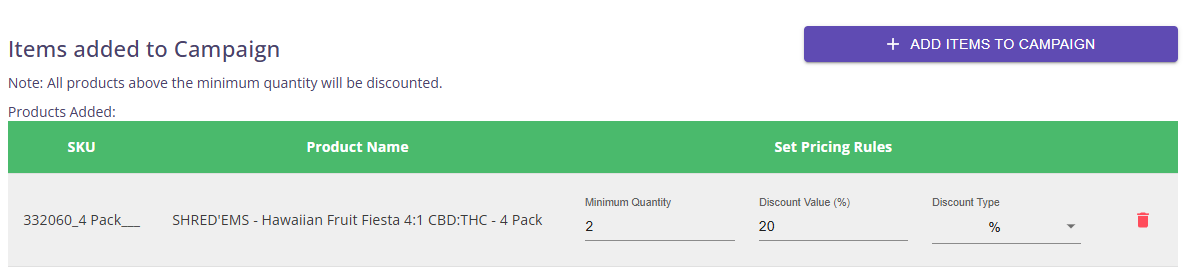 A campaign will automatically apply when eligible products meet the defined criteria. Available pricing rule types: