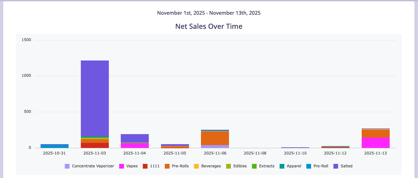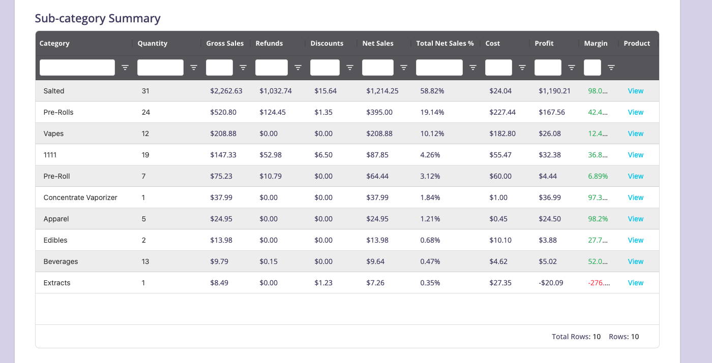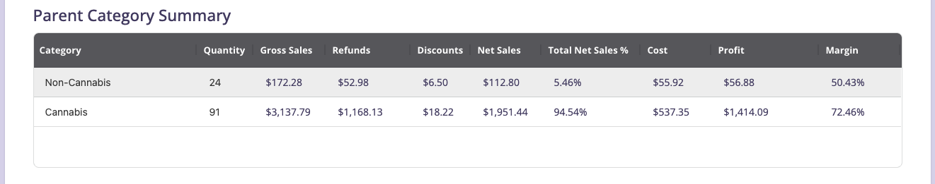 This table summarizes sales by top-level categories (e.g., Cannabis vs. Non-Cannabis).