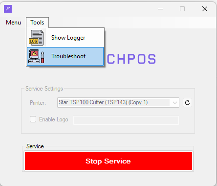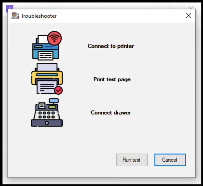 Step 8: Once printer service is stared and running, double-confirm that the printer and cash drawer are functioning and communicating with the printer service. Click Tools > Troubleshoot > Run Test.