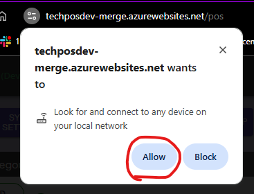 On POS page, before you perform any action after the printer service is installed, first do a hard refresh. After that, any initial action that results in opening a cash drawer and printing a receipt will trigger a permission pop-up at the top of the page, requesting permission to access the network. It is necessary to click "ALLOW". and after that, it will print and open the drawer as expected.