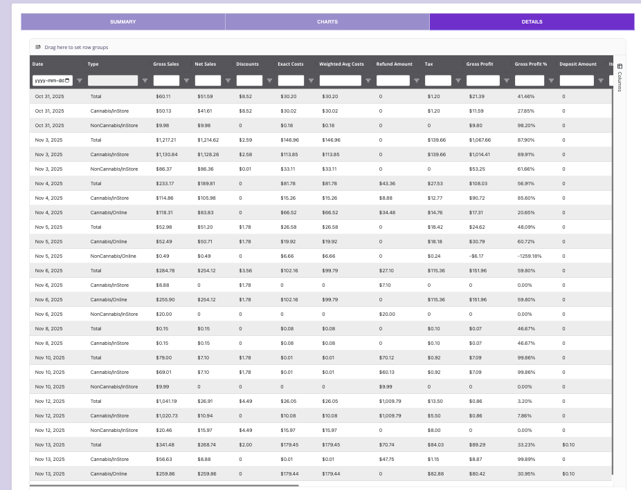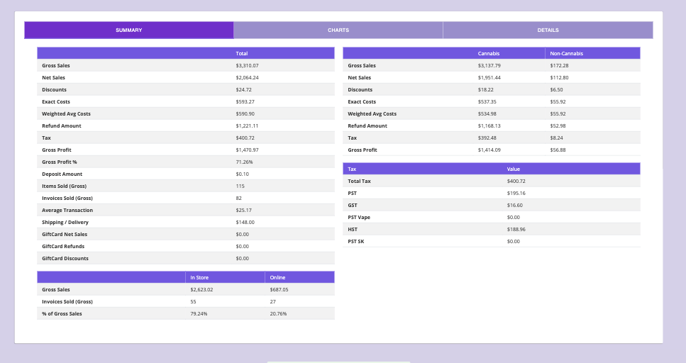 The report provides a full overview of sales performance within a date range. It includes total gross/net sales, refunds, tax breakdowns, cannabis vs. non-cannabis comparison, online vs in-store performance, and detailed transaction-level Details tab