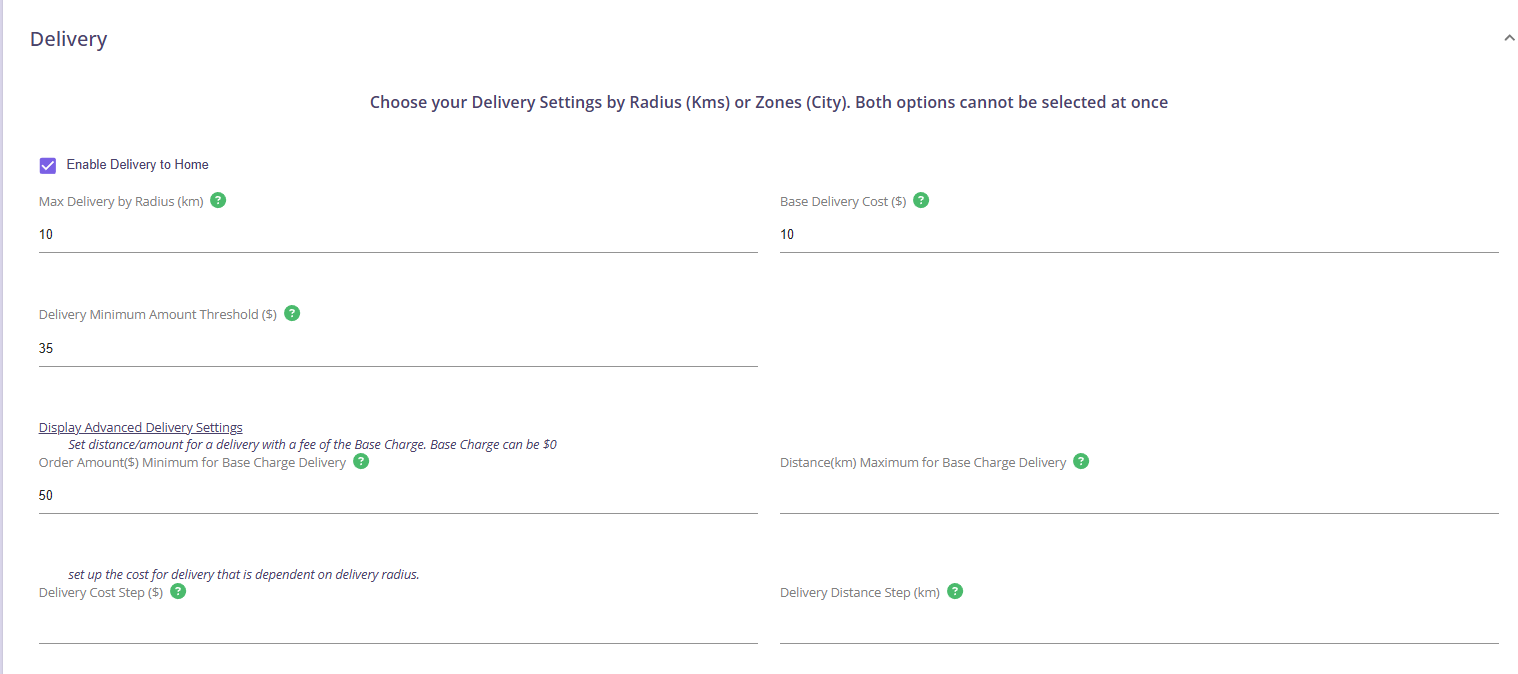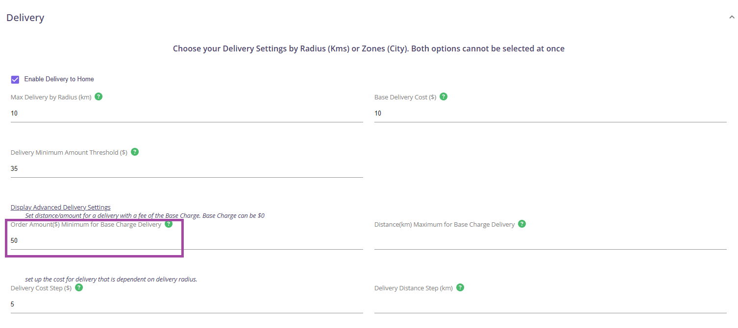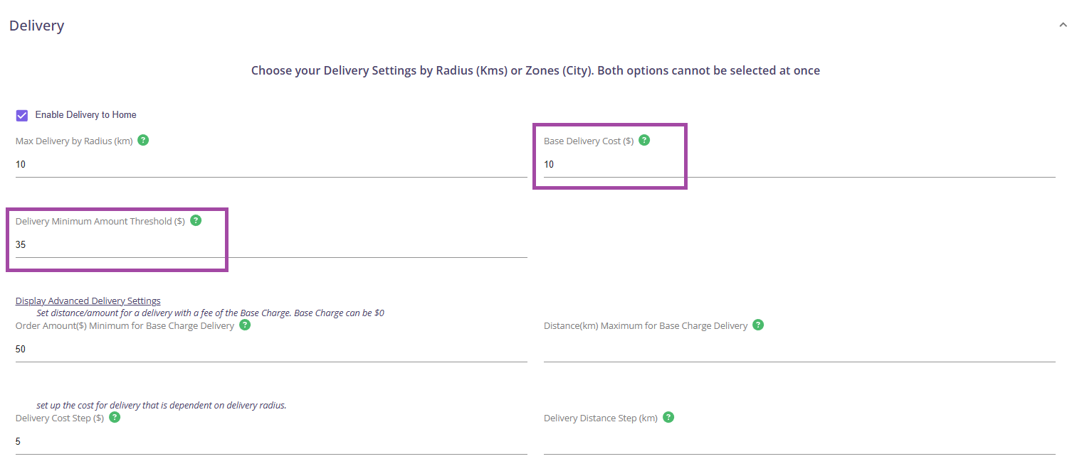 Step 4: Click on Display Advanced Delivery Settings and set the order amount minimum for base charge delivery.