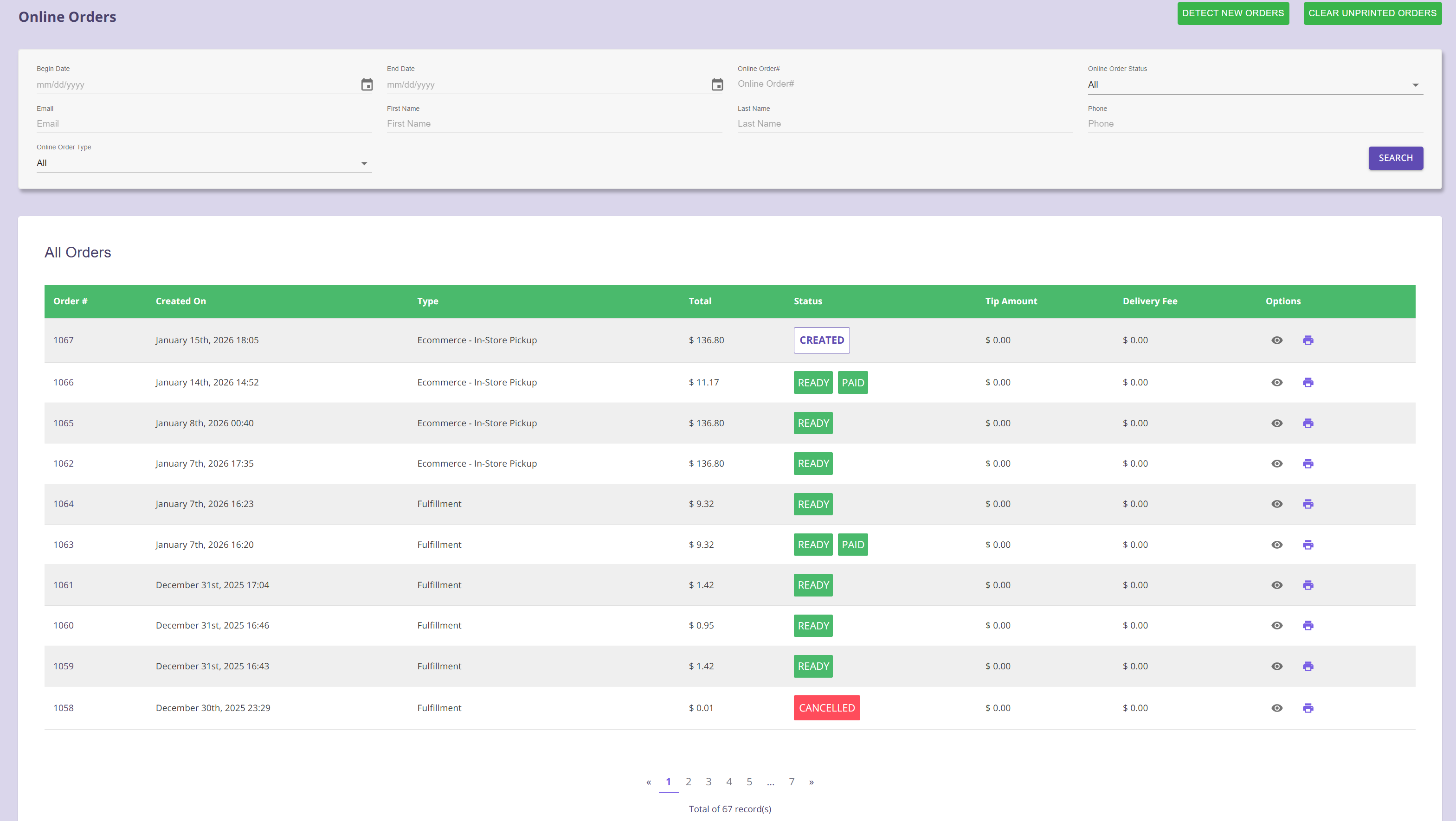 This page is the Online Orders Dashboard, a centralized interface for managing and tracking customer orders. It provides tools for filtering through order history, viewing order status, and performing administrative actions like printing receipts or checking order details.